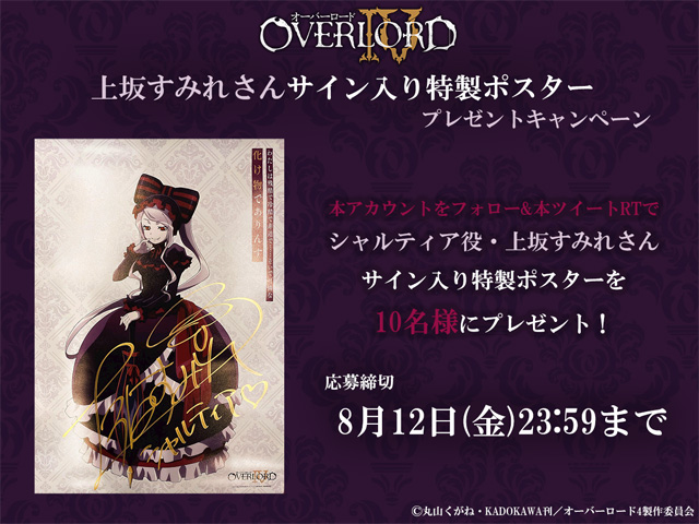 同時に、シャルティア役・上坂すみれさんサイン入りポスターキャンペーンを10名にプレゼントする企画も実施中です。応募方法は『オーバーロード』アニメ公式Twitterアカウントをフォロー&該当キャンペーンツイートをRT。応募期間は8月12日までです。