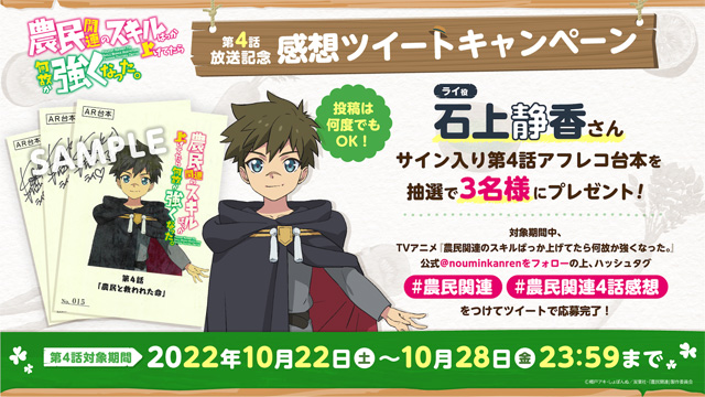 ハッシュタグ付きで『農民関連のスキルばっか上げてたら何故か強くなった。』第4話の感想をツイートすると、ライ役 石上静香さんサイン入り第4話アフレコ台本が抽選で3名に当たるキャンペーンが開催されます。