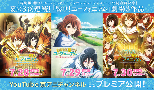 7月28日には2016年に公開された、TVアニメ第1期の総集編となる『劇場版 響け!ユーフォニアム~北宇治高校吹奏楽部へようこそ~』、7月29日には2017年に公開された、TVアニメ第2期の総集編となる『劇場版 響け!ユーフォニアム~届けたいメロディ~』、7月30日には2019年に公開された『劇場版 響け!ユーフォニアム~誓いのフィナーレ~』がプレミア公開されます。